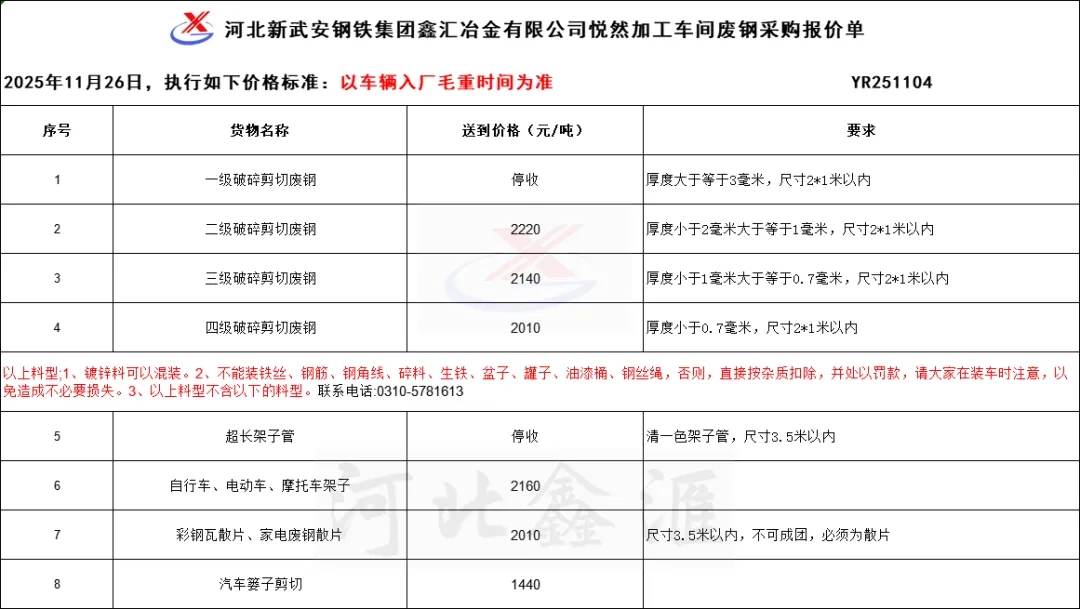 線材銷售、廢鋼采購價格丨2025年11月26日